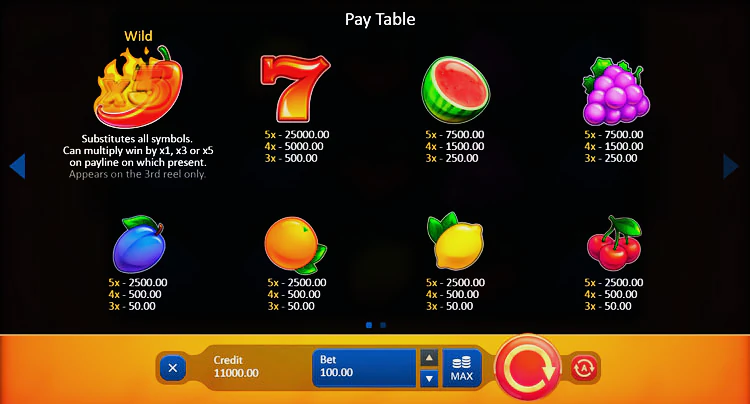 Любителям ретро-фруктовых автоматов и классических слотов наверняка понравится слот Red Chilli Wins благодаря классному дизайну, четкой графике и плавному игровому процессу. В игре нет бонуса бесплатных вращений или вообще каких-либо бонусных раундов, что может отпугнуть некоторых геймеров, а нам бы понравилось музыкальное сопровождение.