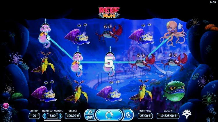 В слоте Reef Run вы можете поставить пять дополнительных монет в качестве так называемой золотой ставки. Это происходит непосредственно перед раундом бесплатных вращений, и для получения выигрыша вам нужно выбрать морского обитателя, который проплывет быстрее всех. Сделав правильный выбор, вы сможете выиграть до 25.000 монет.