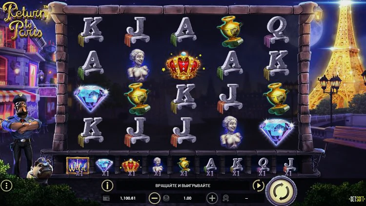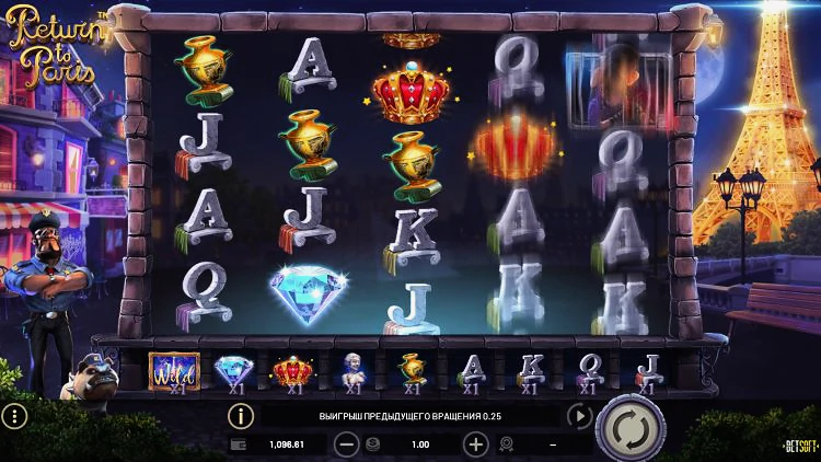 Мы долго ждали слот Return to Paris, основанный на оригинальной игре A Night in Paris от BetSoft, в которой за вором гнался грозный полицейский. В новой игре мы играем на улучшенном наборе барабанов 5х4, который генерирует 20 способов ставок, оплачиваемых слева направо.