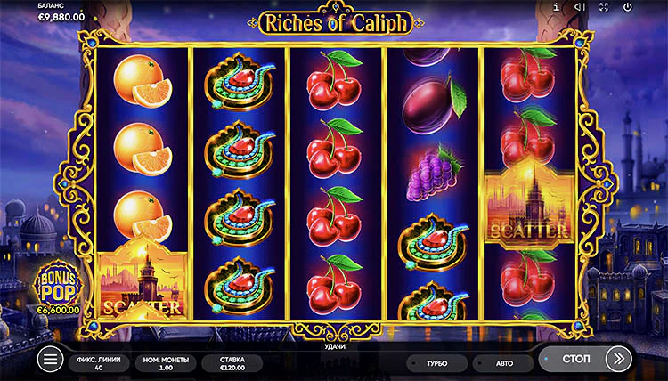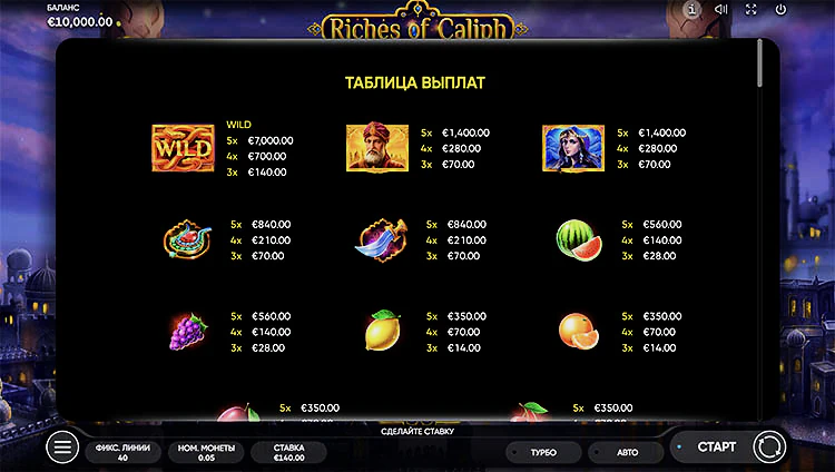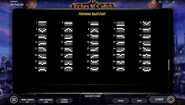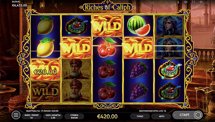 В слоте предусмотрено 40 фиксированных линий выплат, которые засчитываются слева направо. Игровое поле расположено на фоне Халифата. Инструменты управления, автозапуск, турбо-режим размещены под барабанами. Интерфейс слота переведен на 30 языков, нужный легко выбрать в панели управления. Играть в игровой автомат Riches of Caliph в деморежиме и на деньги можно и с мобильных устройств.