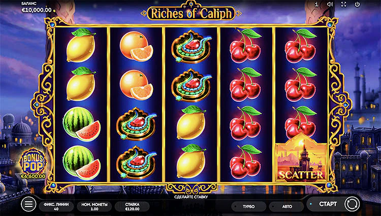 Относительно небольшие выплаты по символам компенсируются бонусными функциями слота Riches of Caliph:т