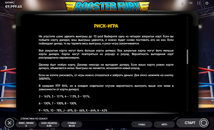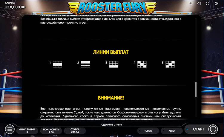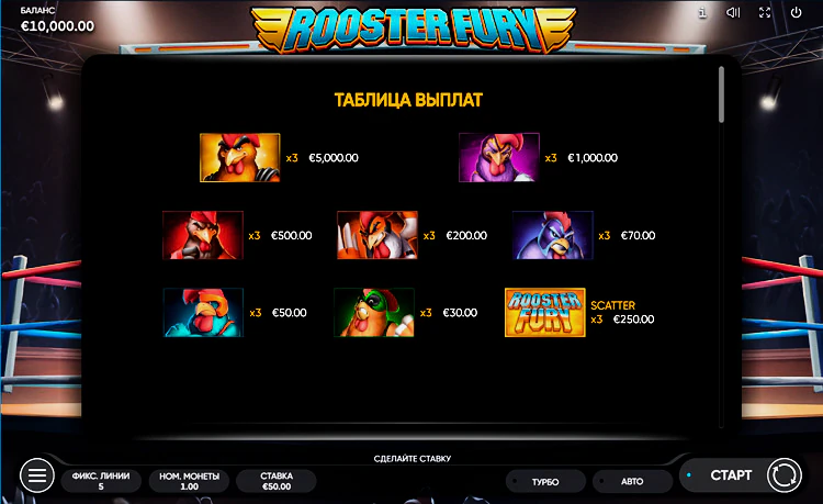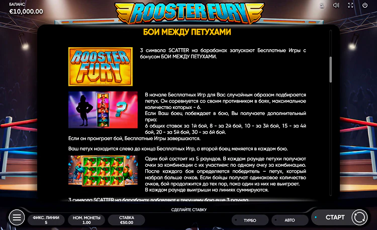 Кстати, Rooster Fury уже доступен в десятках казино онлайн. Его можно тестировать в демонстрационном режиме. Перед началом ставок рекомендуется ознакомиться с описанием тайтла. На панели управления есть информационная кнопка. Она позволит раскрыть детали геймплея и бонусных опций.