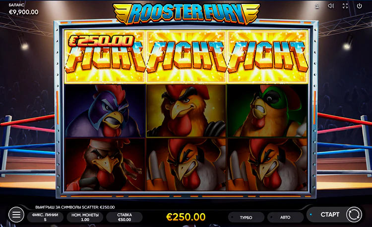 Основная бонусная опция тайтла – это фриспины. Чтобы запустить вращения, клиенту следует получить от 3 символов скаттера с надписью Rooster Fury на экране. После этого автоматически предоставляется до 30 вращений. Однако это не все преимущества бонусной функции. Перед запуском фриспинов случайно выбирается один из петухов. Именно он станет чемпионом гемблера. Если он побеждает после противостояния, участник зарабатывает дополнительные бонусы. Сражение осуществляется в 5 этапов.