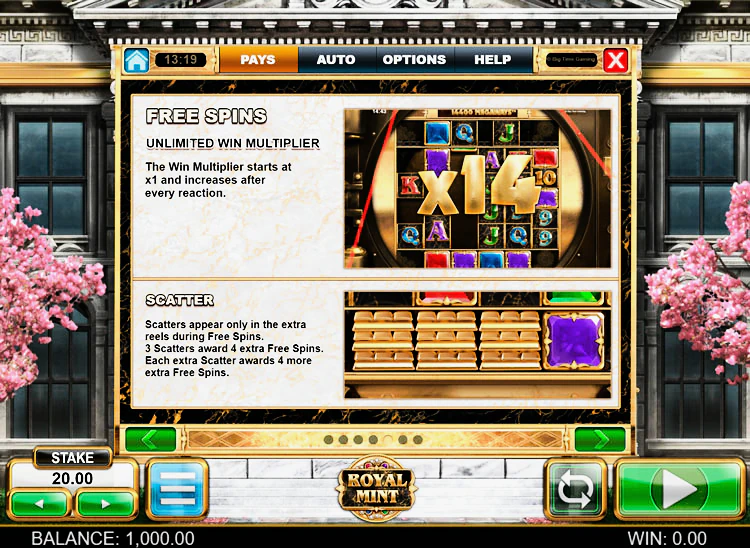 Сам автомат выполнен в жанре драгоценности, о чем свидетельствуют основные символы, формирующие комбо. Помимо каскадных вращений, машина богата фриспинами, респинами и наличием бонусного раунда. Вот лишь часть дополнительных опций игрового автомата Royal Mint: