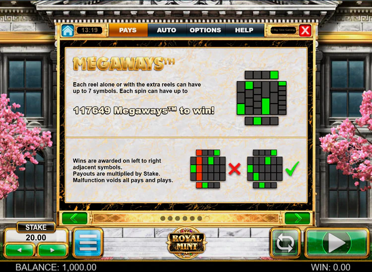 Игровой автомат Royal Mint имеет 6 катушек и 7 рядов. Стандартным игровым полем Big Time Gaming бы точно не ограничился, достаточно вспомнить популярные релизы: Donuts, Monopoly и конечно Bonanza. Royal Mint в свою очередь не остался без дополнительных символов, режим каскадных вращений здесь реализовывается после выпада одной из старших комбинаций. Если игроку удастся собрать комбо, количество активных линий расширяется, их максимальное значение 117 649!
