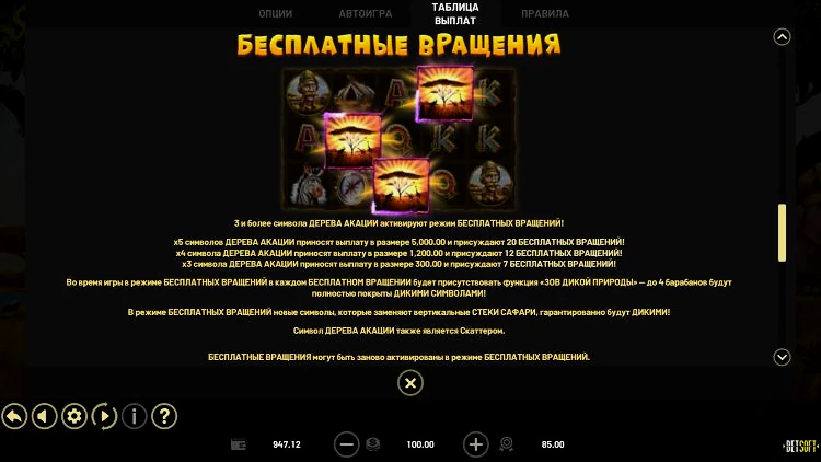 Если 3 или более символов Acacia Scatter появятся на барабанах, это запустит бонус Free Spins. Игроки получают 7, 12, 20 бесплатных вращений за 3, 4 или 5 символов соответственно. Во время каждого спина в этом раунде появляется Call of the Wild, увеличивающий шансы на выигрыш, а также все новые символы, выпадающие на месте стопок Safari, гарантированно становятся Wild’ами.