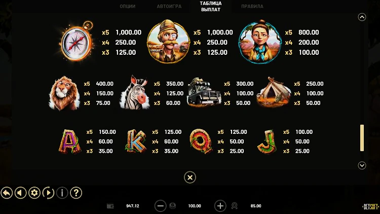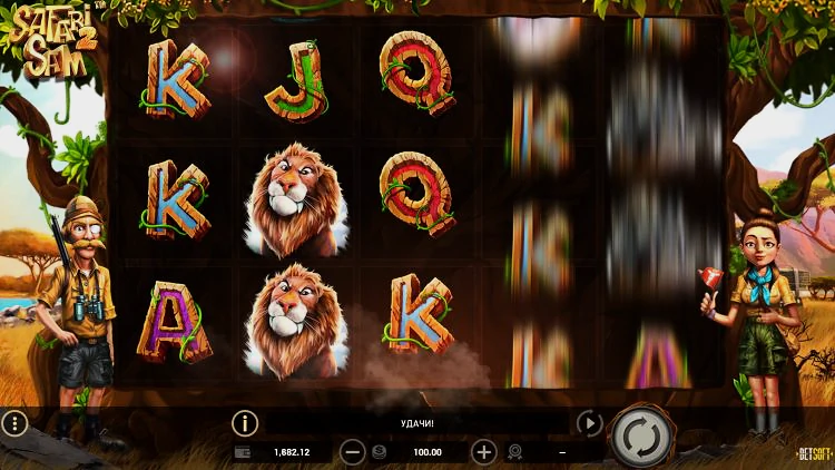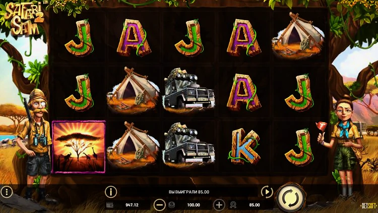 Safari Sam 2 — это сиквел слот-игры от Betsoft с барабанами 5×3 и 50 линиями выплат. На барабанах расположено 12 символов — 4 карточных, 6 более высокооплачиваемых тематических картинок и 2 специальных символа. Символ компаса — это Wild, который заменяет любой стандартный символ. Дерево акации — скаттер, который оплачивается при выпадении 3 и более символов и запускает раунд бесплатных вращений.
