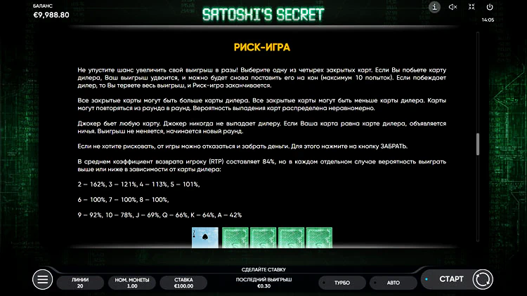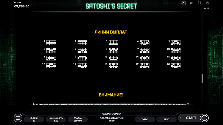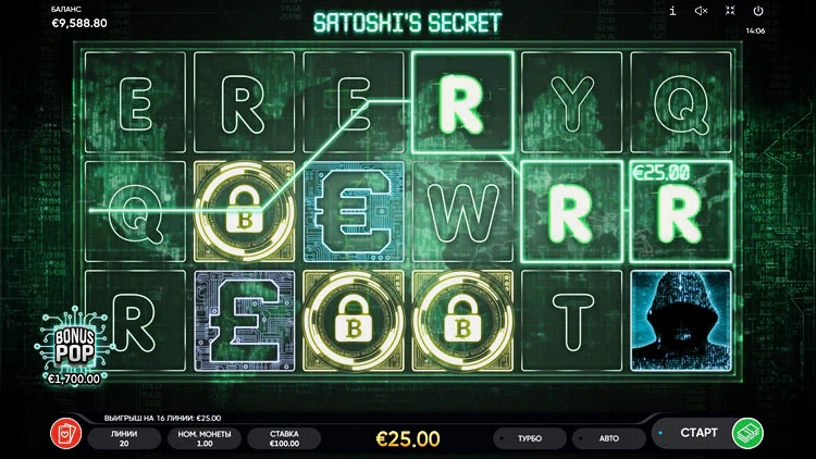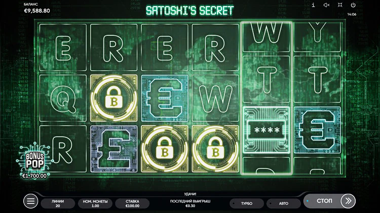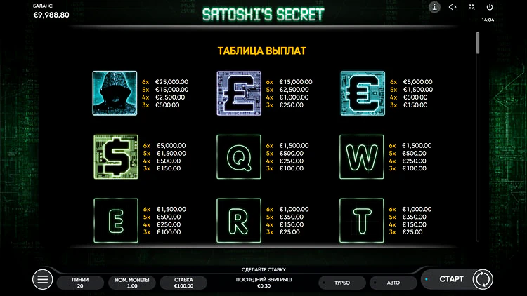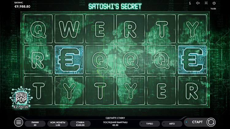 Игровой автомат Satoshi’s Secret состоит из 6 барабанов и 20 линий выплат. Вдохновлен темой криптовалют, а именно — биткоина. Установите номинал монеты в диапазоне от 0,01 до 5 и запустите слот от Endorphina. В обзоре автомата подробнее разберем все его особенности, уникальные символы и бонусные раунды.