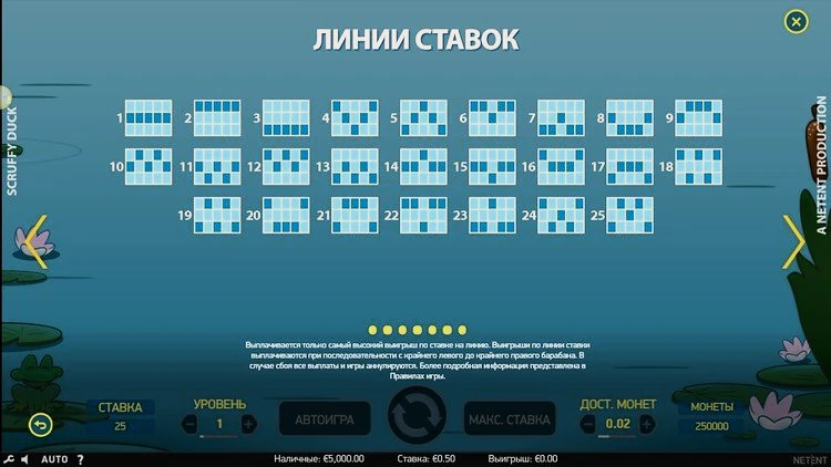 В игровом автомате Scruffy Duck нас ждет 25 фиксированных линий выплат. Это значит, что барабаны (а их у слота 5) не меняют свою форму, в зависимости от раунда. Чтобы получить выигрыш, нужно собрать комбинацию как минимум на трех таких линиях. Отдача у слота средняя, 96,3% На длинной дистанции игроки получают довольно неплохие шансы на победу.