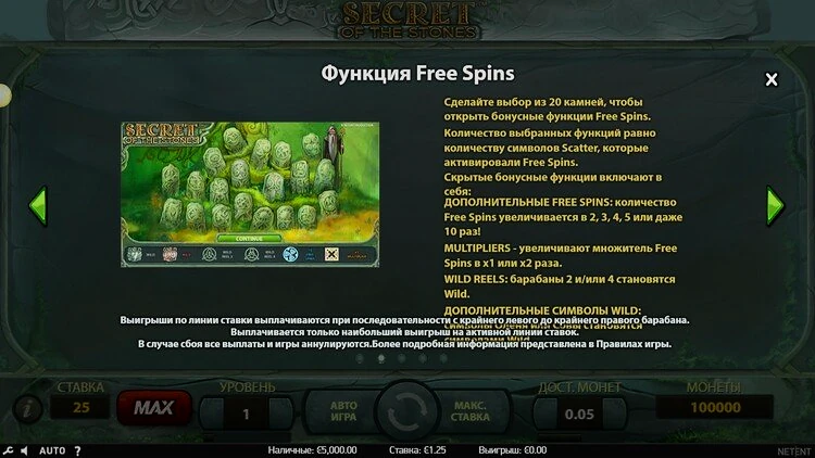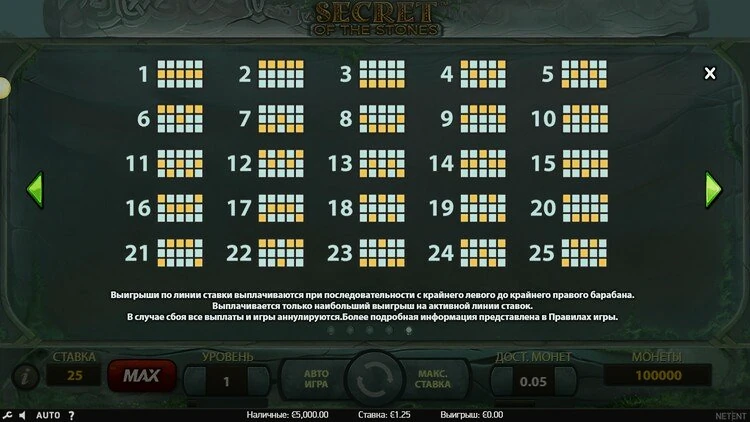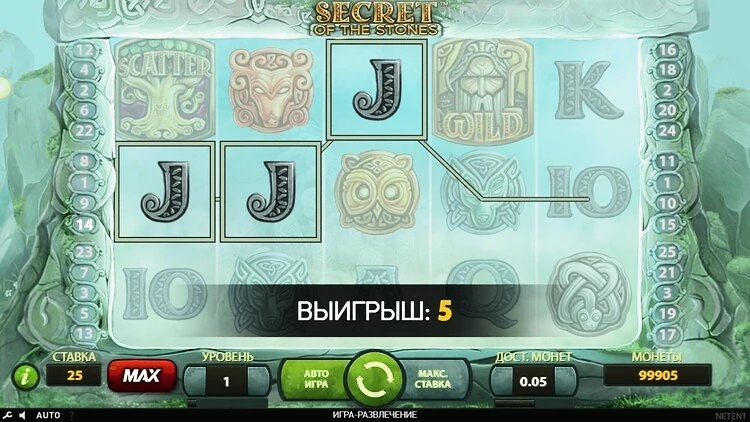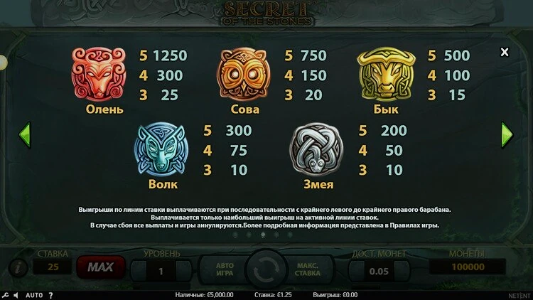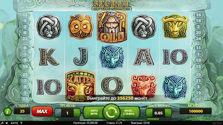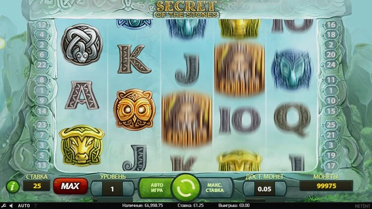 Все, что вам нужно сделать, это составить комбинации как минимум из трех одинаковых символов. Это не так уж сложно, особенно если вы используете все 25 линий выплат, но стоит отметить, что разные символы имеют разное значение, поэтому вы будете получать разные призы за разные комбинации.Secrets of the Stones от NetEnt имеет RTP 96,7%. Эта игра с низкой волатильностью. Это означает, что в игре часто выплачиваются выигрыши, поэтому слот идеально подходит для игроков, которые не хотят сильно рисковать.
