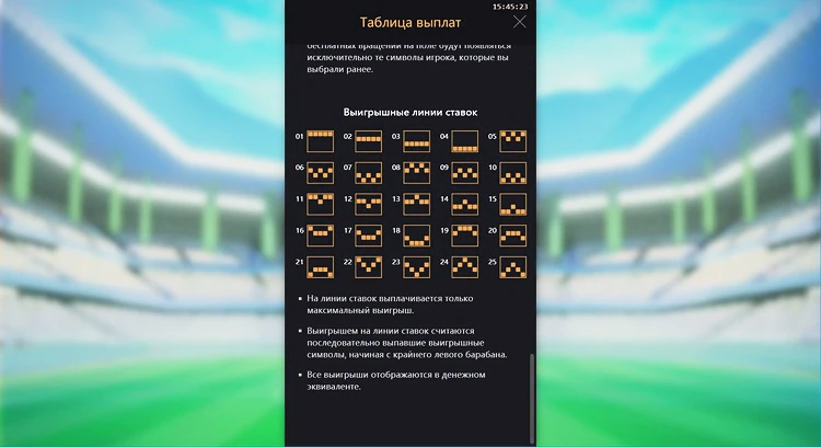 Выстройте три, четыре или пять одинаковых символов на одной из 25 линий выплат, чтобы выиграть денежный приз — или виртуальный денежный приз, если вы играете в демо-режиме. Выплаты по символам зависят от вашей ставки на линию следующим образом: