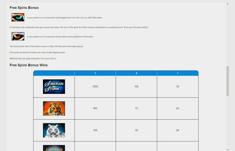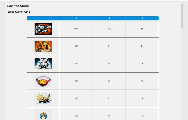 Самым прибыльным символом игры является логотип Siberian Storm. Чтобы выиграть 50 монет, вам нужно выпасть три таких символа на барабанах подряд, четыре — 150 монет, а пять — невероятную сумму в 1 000 монет.