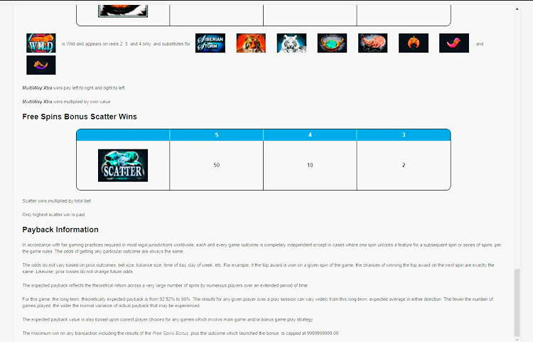 В Siberian Storm есть в общей сложности 720 способов выиграть. Это немного отличается от стандартных линий выплат, которые вы можете ассоциировать с обычными и более традиционными слот-машинами. Вместо традиционных линий выплат все символы в Siberian Storm выплачиваются по соседству. Это означает, что для создания выигрышной комбинации необходимо, чтобы совпали символы на соседних линиях выплат. Они идут слева направо и начинаются с крайнего барабана слева.