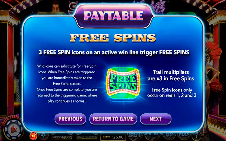На барабанах присутствуют все традиционные иконки, включая вишенки, карточные масти, семерки, золотые колокольчики, вайлды и бесплатные вращения, и они подсвечиваются, как все здания в Городе Грехов. Кстати, о Городе Грехов: только половина Вегаса описывается азартными играми. Вторая половина — женщины — также присутствует в этой игре: сексуальная шоу-герл представляет перед вами барабаны и радует экзотическими танцами каждый раз, когда вы выигрываете.