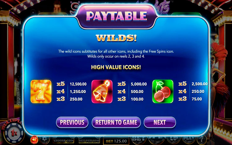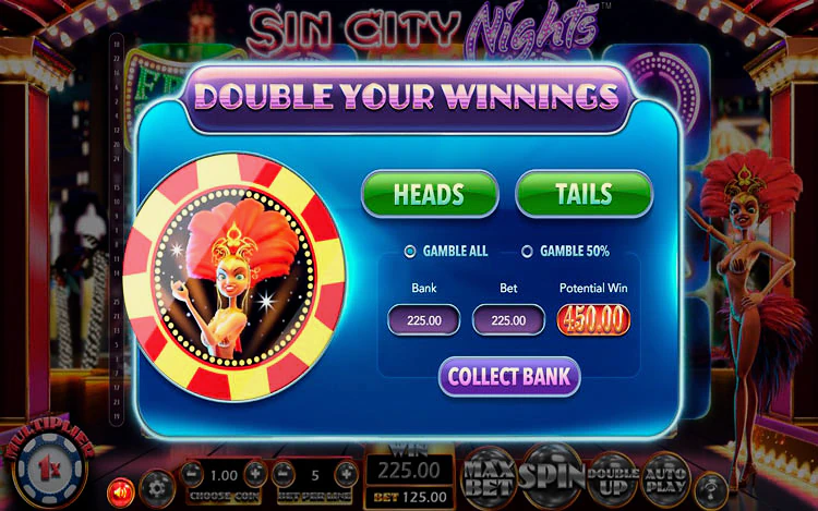 Специальные функции, предлагаемые Sin City Nights, отличают его от других онлайн слотов. Одной из самых крутых функций является опция Double Up, в которой у вас есть шанс удвоить свой выигрыш при каждом выпадении комбинации путем подбрасывания монетки. Продолжайте бросать монетку и удваивайте свой выигрыш снова и снова, превращая комбинацию из $25 в выигрыш $25 000.
