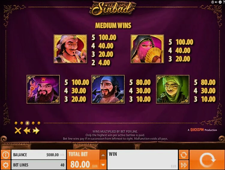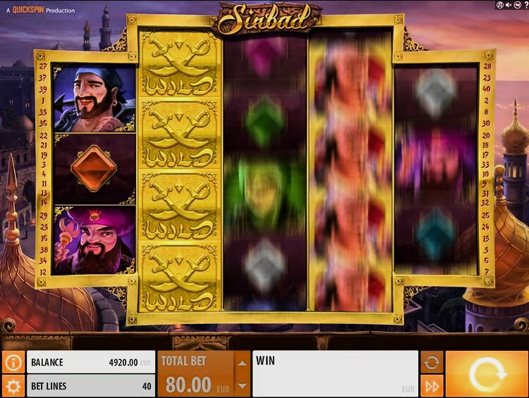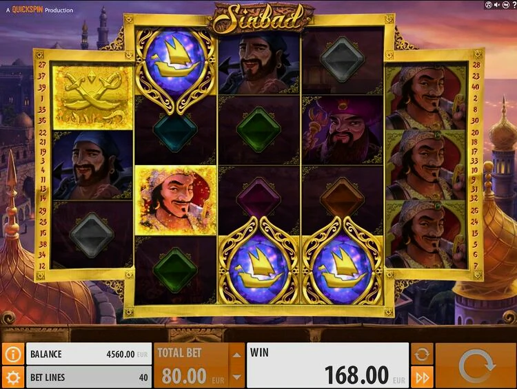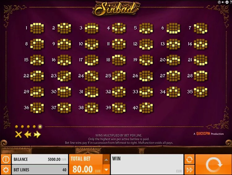 На экране игроки видят 5 барабанов, но в необычной форме, они размещены в формате 3х4х4х4х3. В общей сложности эта настройка предоставляет вам 40 выигрышных линий. Начать играть в игровой автомат Sinbad в деморежиме можно после установки величины ставки. Диапазон варьируется от 0,40 до 100 кредитов за спин.
