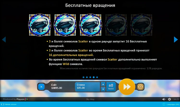 Обратите особое внимание на дирижабль, который запускает функцию бесплатных вращений в этом слоте. Дирижабль выступает в качестве символа Scatter, и если на барабанах выпадет не менее трех таких символов, капитан предложит вам сыграть в 16 бесплатных игр. Во время бонусной игры дирижабль также становится дополнительным Wild-символом. При появлении еще трех дирижаблей функция будет перезапущена.