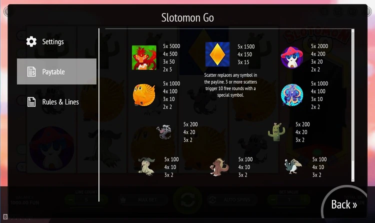 Дикий и скаттер символы слота Slotomon Go представлены желтым драгоценным камнем. Это универсальный символ, который может заменить любой обыкновенный символ для формирования выигрышной комбинации. Кроме того, выпадение 3 и более скаттеров активирует режим бесплатных игр с фриспинами. Желтый драгоценный камень также приносит щедрые выплаты, достигающие 1.500x от общей ставки, когда он появляется на барабанах.