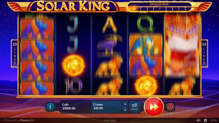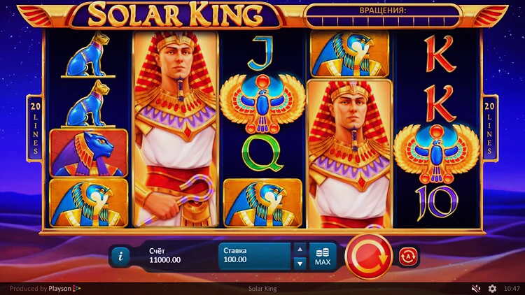 Solar King — это древнеегипетский онлайн-слот с отличием. Его обстановка — это мрачное великолепие, которое скорее напоминает интерьер сновидения. Катящиеся пески пустыни, залитые луной, уходят к сумрачному горизонту, а на небе сверкают звезды.
