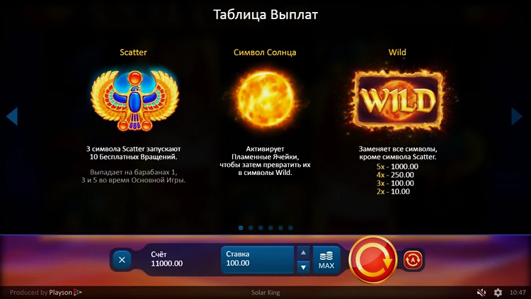 Обстановка также динамична. Как только вы нажмете кнопку «Спин», зазвучит оживленная египетская мелодия струнных и барабанов, и взойдет солнце. Оно окрашивает пустыню в румяные оттенки, пески горят, оживляя мир слота. Solar King — это потрясающее творение от Playson, и нам остается только пожелать, чтобы другие разработчики так же внимательно относились к дизайну.
