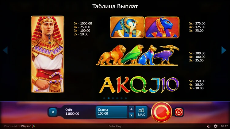 Наибольший выигрыш на одной линии составляет 10x, и для его получения вам понадобится пять фараонов на одной игровой линии.