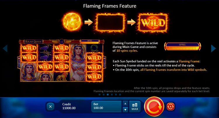 Особенностью игры Solar Queen является возможность сорвать куш не только в бонусных раундах. В Solar Queen есть функция «Пылающие рамки» – она активна во время основной игры и состоит из 10 циклов вращений. Каждый символ Солнца, выпадающий на барабане, активирует пылающую рамку. При 10-м вращении все Пылающие рамки превращаются в символы wild. Если выпадет много солнечных символов, это может привести к крупным выигрышам. Более того, множитель увеличивается на 1 каждый раз, когда символ солнца попадает в существующую Пылающую рамку.