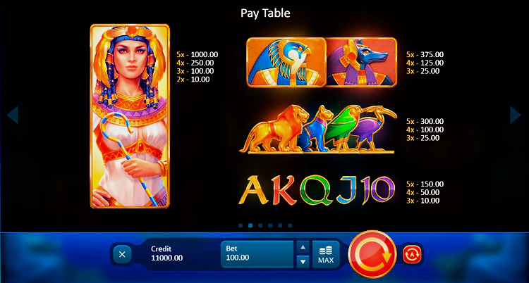 Слот пропитан древнеегипетской темой и высокооплачиваемые символы ей соответствуют. Приз за комбинацию выдается, если пользователю удалось собрать 3-5 одинаковых символов слева направо на линии.