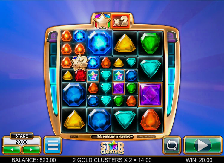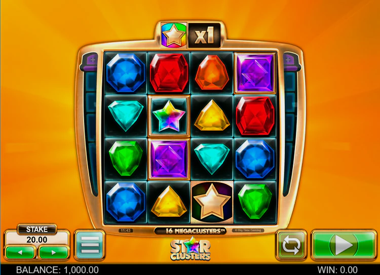 Big Time Game отличается от конкурентов оригинальным сюжетом и умением объединять в один релиз сразу несколько тематик. Так было и с онлайн слотом Star Clusters. Здесь переплелись сразу 2 жанра: сокровища (основные символы представлены в виде драгоценных камней) и космос (дизайн игрового поля дополняет мерцание созвездий, расположенное на ночном небе.