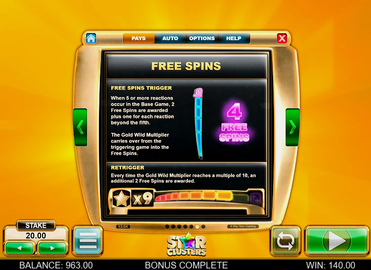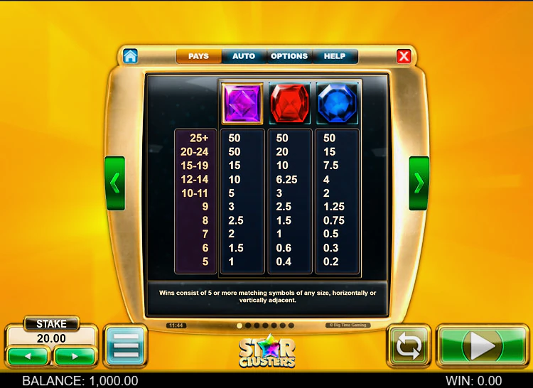Big Time Game оснастил онлайн слот Star Clusters демонстрационным режимом, благодаря чему сыграть в него можно как бесплатно, так и на реальные деньги.