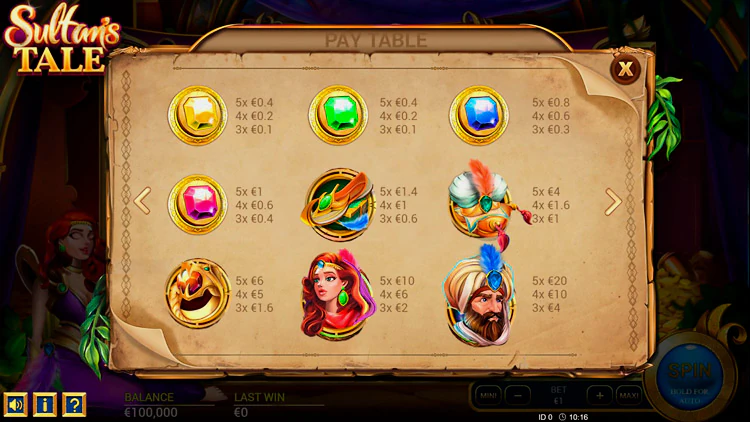 Начнем с визуала: графика красочная и все персонажи, символы прорисованы четко, фоновый рисунок приятен взору. Приятный саундтрек предполагает расслабляющий эффект. Играть в игровой автомат Sultan’s tale бесплатно после напряженного рабочего дня — идеальный вариант.