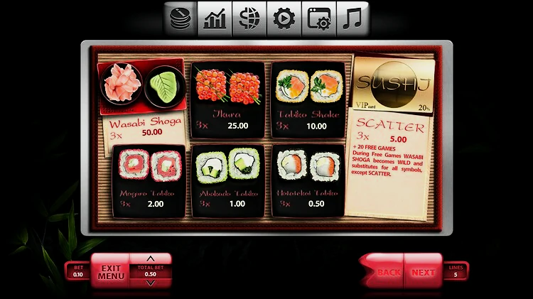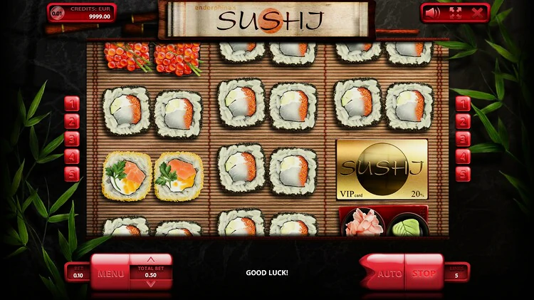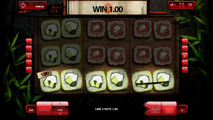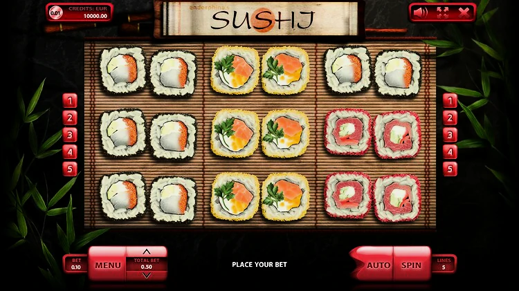 Sushi имеет 3 барабана, 3 ряда и 5 линий выплат, RTP 96,00% и среднюю, стремящуюся к высокой, волатильность. Слот также повышает вероятность выигрыша, предлагая дополнительные функции, увеличивающие потенциальный выигрыш.