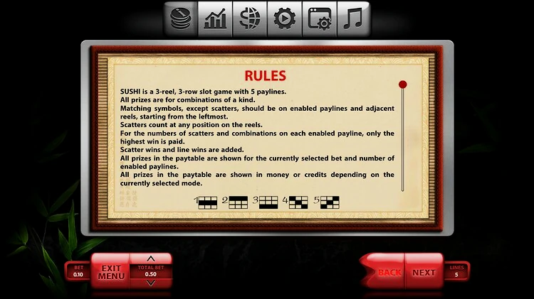 В слоте Sushi всего 5 линий выплат, количество которых можно настроить по своему усмотрению. Наличие трех барабанов избавляет от необходимости думать о том, как составить выигрышную комбинацию – всё очевидно. Обратите внимание на то, что символы могут выпадать стопками, что повышает вероятность того, что вам удастся покрыть все игровое поле одинаковыми символами.