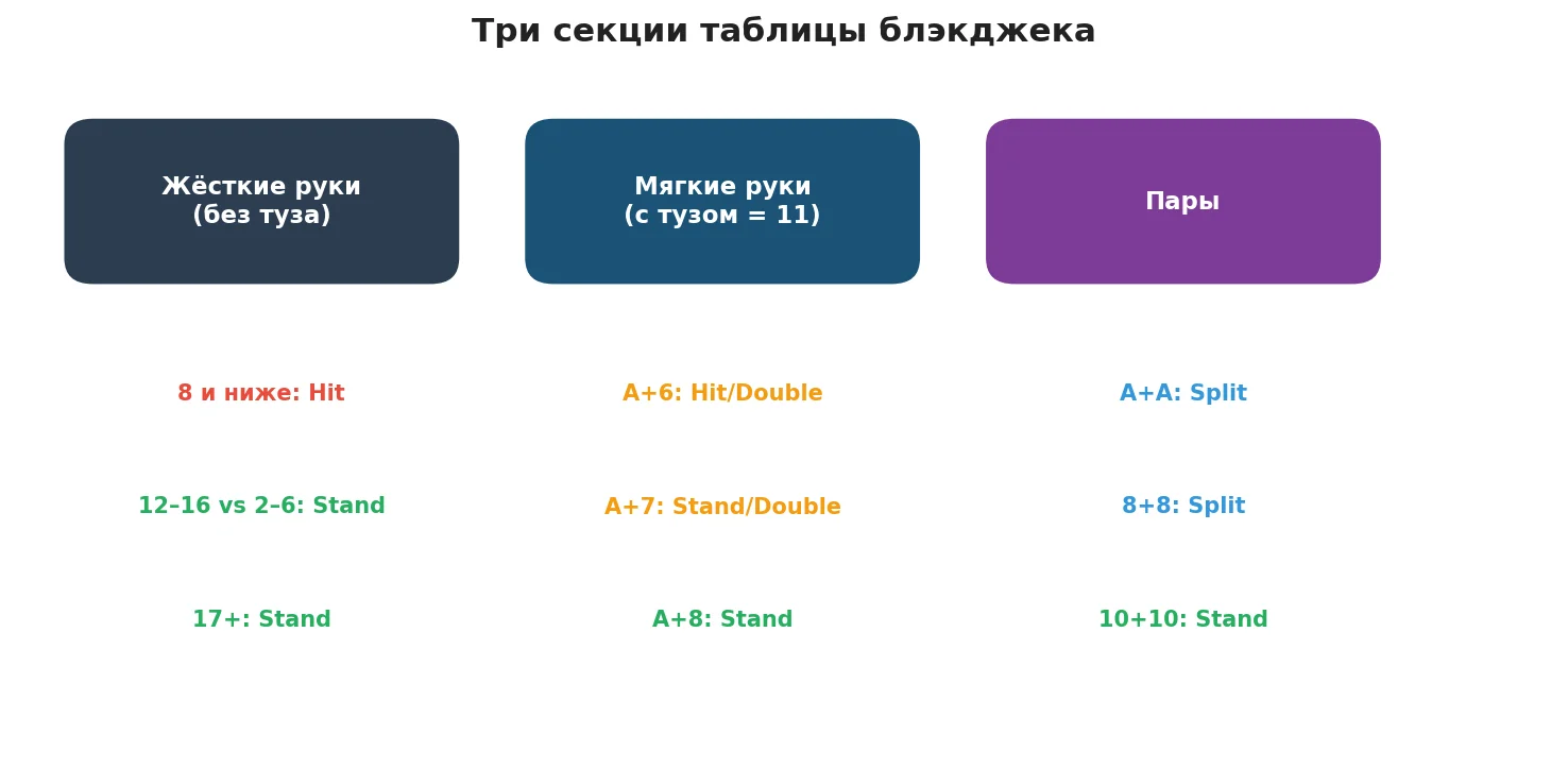 Полная таблица стратегии делится на три секции: жёсткие руки, мягкие руки и пары. В каждой — свои правила.
