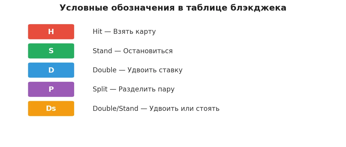 Таблица блэкджек — шпаргалка, которая подсказывает оптимальное действие для каждой комбинации карт за столом. По горизонтали — открытая карта дилера, по вертикали — ваша рука. На пересечении написано, что делать: брать карту (hit), остановиться (stand), удвоить (double) или разделить (split). Запомнить всё наизусть за вечер нереально, но таблицу для блэкджека (blackjack) на русском можно держать перед глазами — в большинстве онлайн-казино это разрешено.