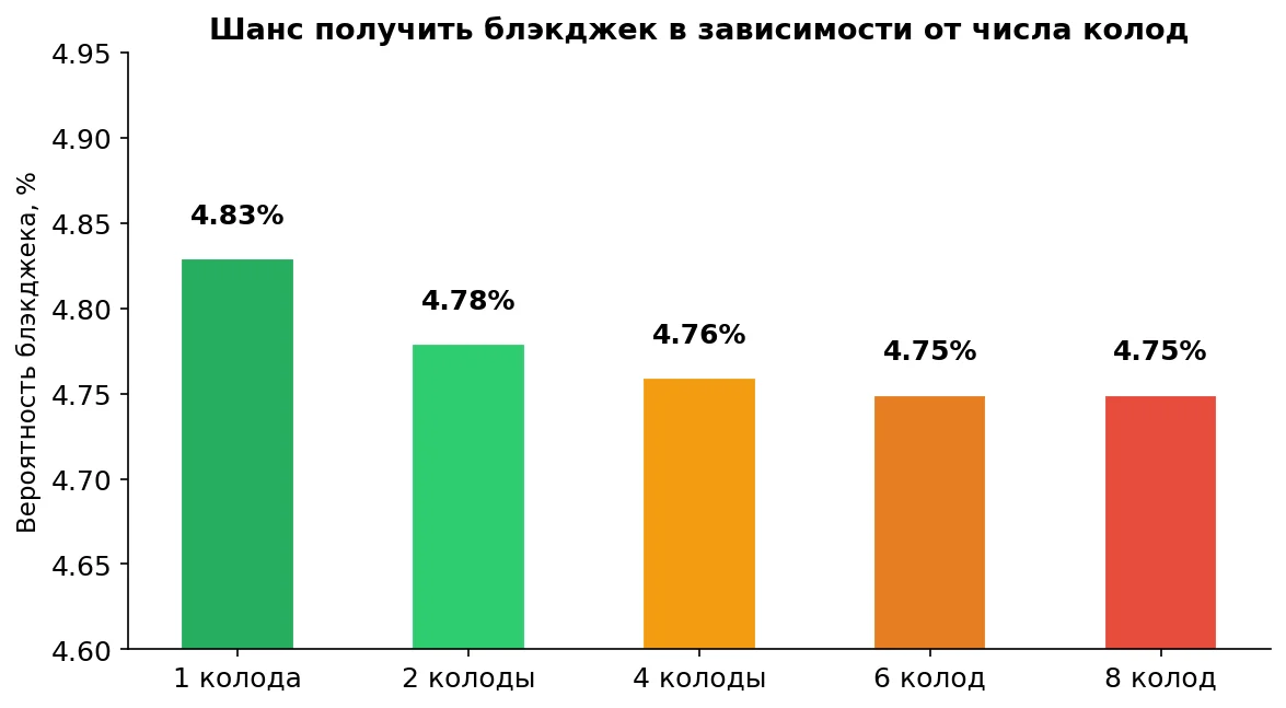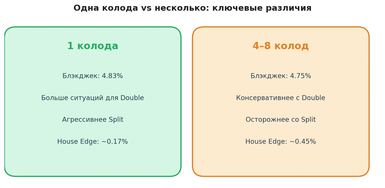 Одноколодный блэкджек встречается реже, но считается самым выгодным для игрока. Главные отличия от мультиколодной версии: чаще выгодно делать double на мягких руках, и разделять двойки и тройки можно агрессивнее. При одной колоде вероятность получить black jack чуть выше (4.83% против 4.75% при 8 колодах), а удвоения оправдываются чаще.