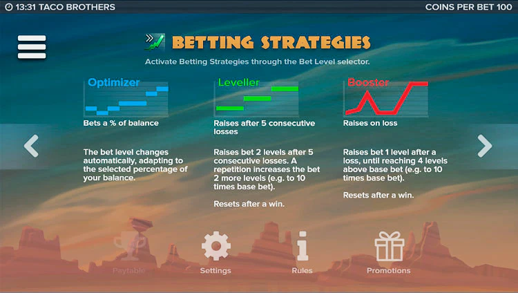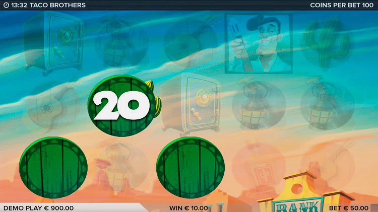Теперь игровое поле в демо-версии слота Taco Brothers состоит из 6 барабанов, 4 рядов и пересекается 466 соединяющимися линиями выплат. Выигрышные комбинации начинаются на крайнем левом барабане и выплачиваются слева направо на соседних барабанах, но для этого они должны соприкасаться по горизонтали или диагонали.