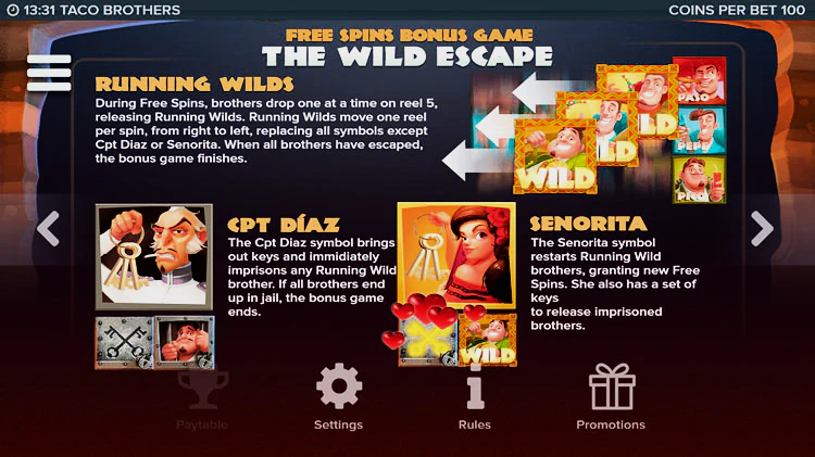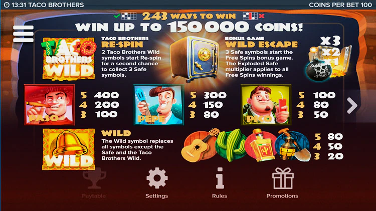 Игровые символы в слоте Taco Brother при бесплатной игре онлайн могут выпадать в виде ходячих джокеров. Они перемещаются на одно место влево, и каждый шаг запускает респин. Респины заканчиваются, когда ходячие символы выпадают с крайнего левого края. Ходячие символы Wild также превращают любой соответствующий игровой символ Taco Brother в дикий символ. Дикий символ Walking Multiplier немного отличается и появляется только в верхнем ряду. В нем есть множитель, и всем обычным джокерам присваивается одинаковый множитель.