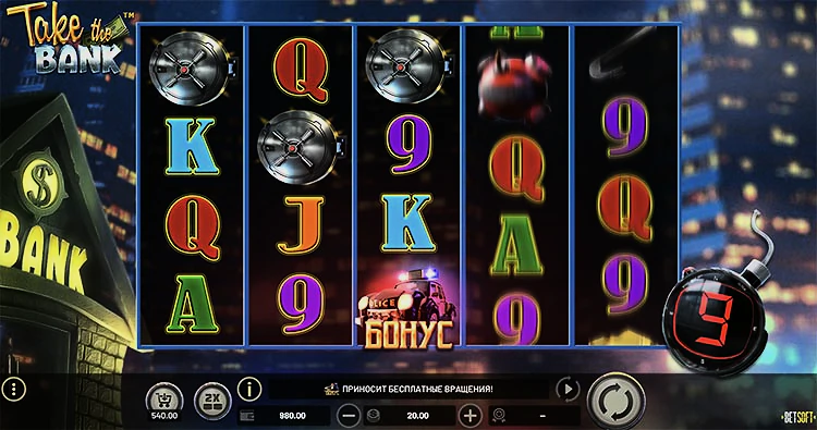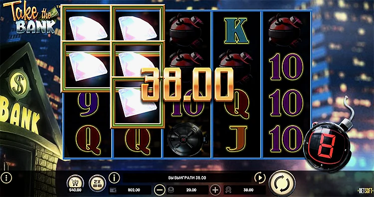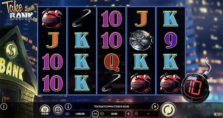Take The Bank считается прогрессивной игрой, в которой вы играете раундами по 10 спинов. За каждый спин, который вы запускаете, мастер-счетчик бомб продвигает часы обратного отсчета от 10 до 0. Все символы Robber, которые вам попадаются, собираются и превращаются в бомбы, которые после 10 спинов превращаются в вайлды.