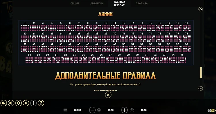 Ставки в игре варьируются от $0,20 до $20. В этом диапазоне вы можете выбрать одиннадцать различных значений ставок. Какая бы ставка ни была выбрана, в обмен вы получите все 75 активных линий.