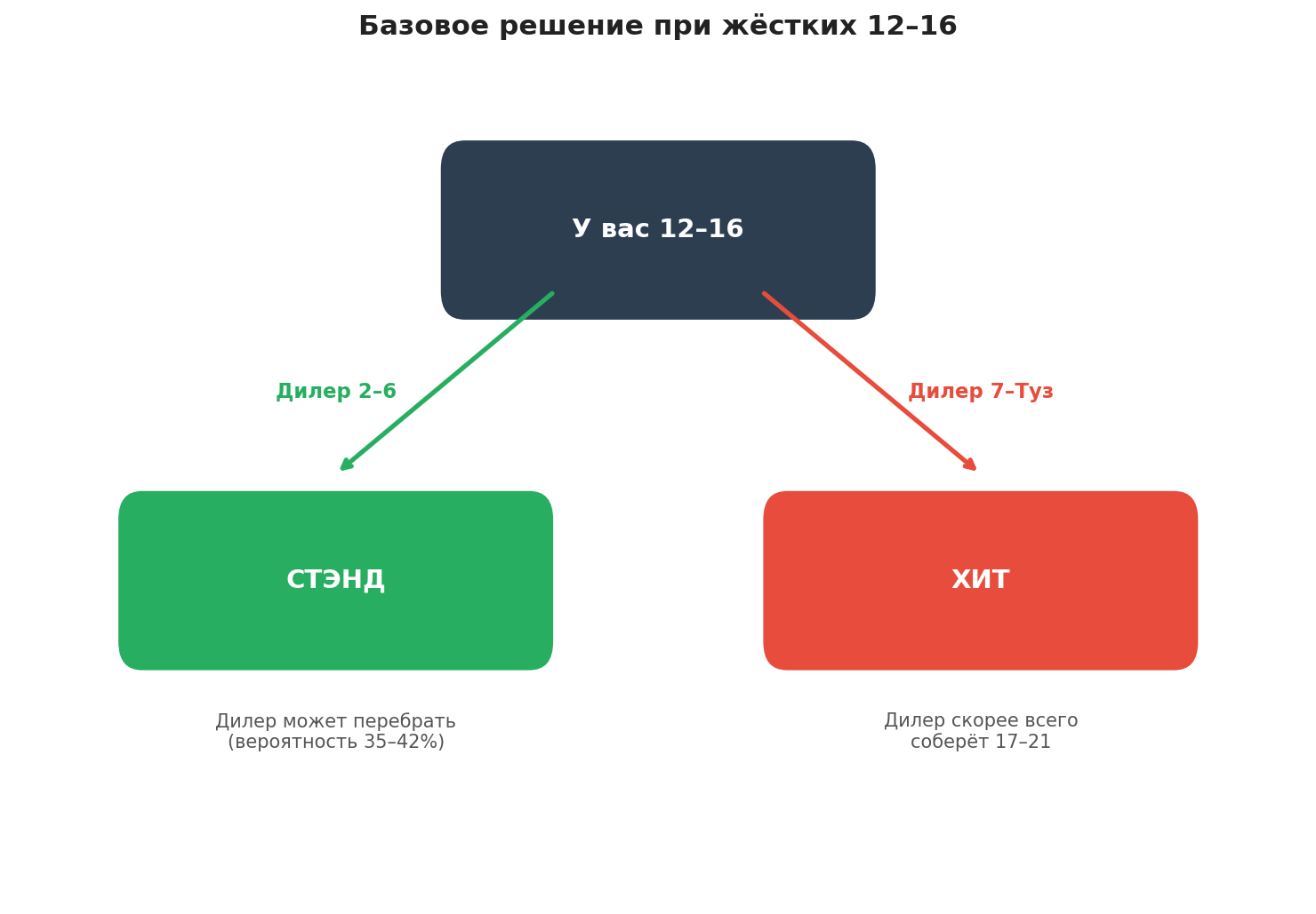 Отсюда и логика: базовая тактика рекомендует стоять при 12–16 против слабой карты дилера (2–6): шанс на перебор у крупье достаточно высок, и рисковать собственной рукой нет смысла.