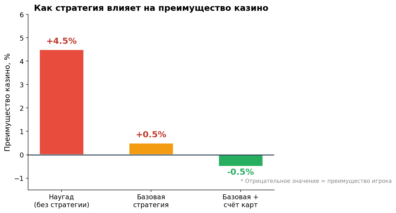 Базовая стратегия блэкджека урезает перевес казино, но не убивает его совсем. На длинной дистанции заведение всё равно выигрывает — просто медленнее.