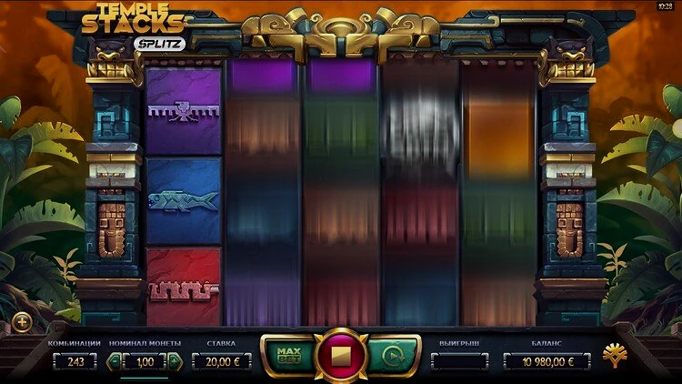 Temple Stacks Splitz — это игра с 243 способами выигрыша, но итоговая сумма меняется в зависимости от количества символов, появляющихся на барабанах (подробнее об этом позже). На этом слоте вы можете делать самые разные ставки — от 20 до 100 монет. Таким образом, и хайроллеры, и игроки в копеечные слоты имеют возможность насладиться этой игрой.
