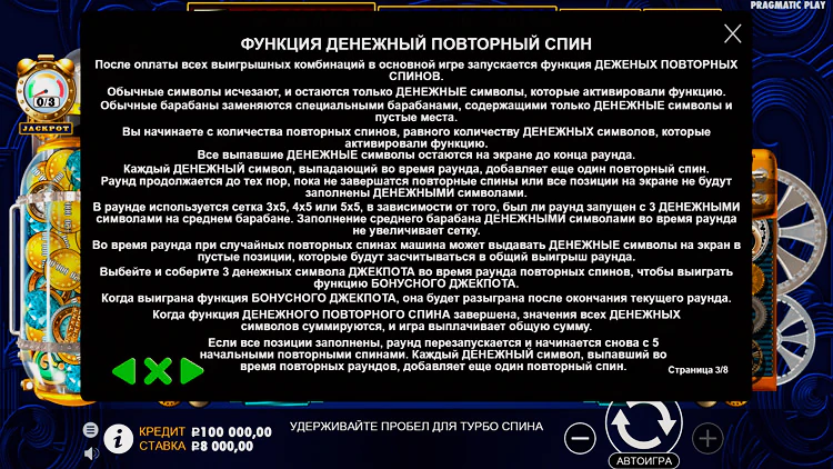 Запомните главное – только во время открутки респинов вы можете вытащить JACKPOT. Для активации максимально возможного множителя, вам необходимо собрать 3 MONEY-символа с гравировкой «джекпот». Как только вы активируете последний символ, запустится новый рауд.