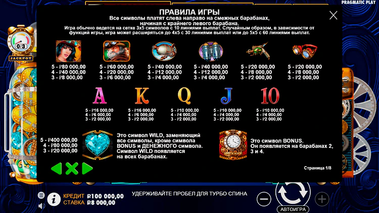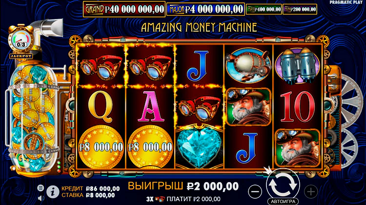 The Amazing Money Machine – настоящая гордость в каталоге передового разработчика Pragmatic Play. Пожалуй, это один из лучших автоматов в жанре стим-панк. Особый шарм и инновационную изюминку тайтлу придают динамично расширяющиеся катушки, увеличивающаяся игровая сетка и 30 дополнительных линий, которые можно активировать во время бонусного раунда.