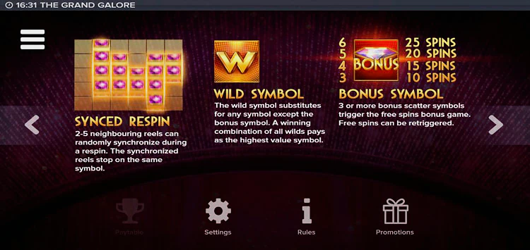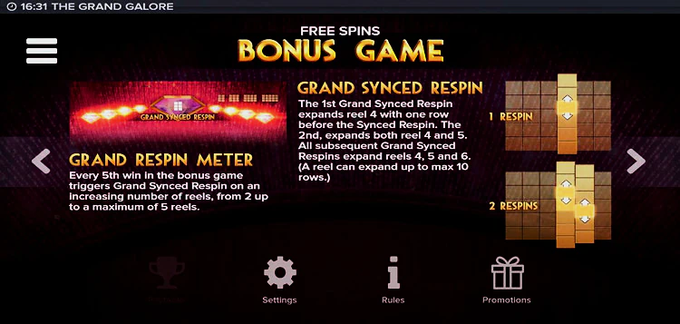 В первом Grand Synced Respin четвертый барабан удлиняется на одну линию до того, как произойдет Synced Respin. Во втором Grand Synced Respin расширяются четвертый и пятый барабаны. Все последующие раунды Grand Synced Respin приводят к расширению барабанов с 4 по 6. Эта механика придает, казалось бы, стандартной бонусной функции фриспинов интересную особенность, которая повышает шансы на самый благоприятный исход.