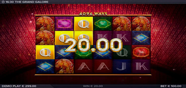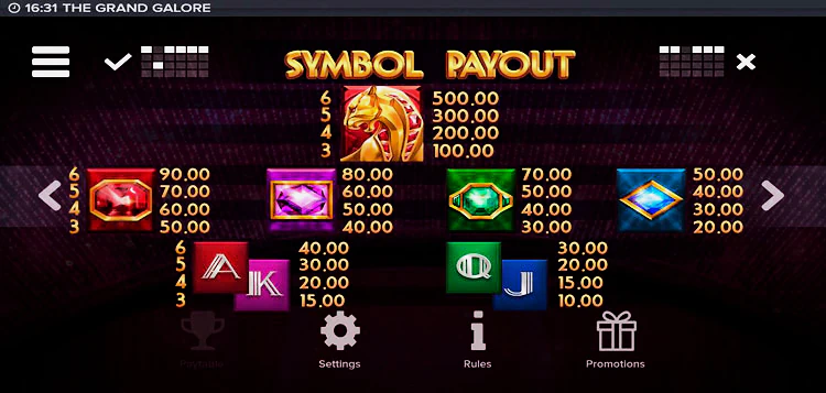 В Grand Galore представлены символы с высокой стоимостью, такие как роскошная золотая пантера, рубины и драгоценные камни. Комбинации с этими символами могут приносить выплаты от 20 до 500 монет, обеспечивая наиболее удачливым игрокам большие вознаграждения. С другой стороны, менее оплачиваемые символы состоят из стандартных карточных номиналов A, K, Q и J. Формирование линий с этими символами дает выигрыш от 10 до 400 монет, причем точная сумма зависит от количества одинаковых символов в комбинации.