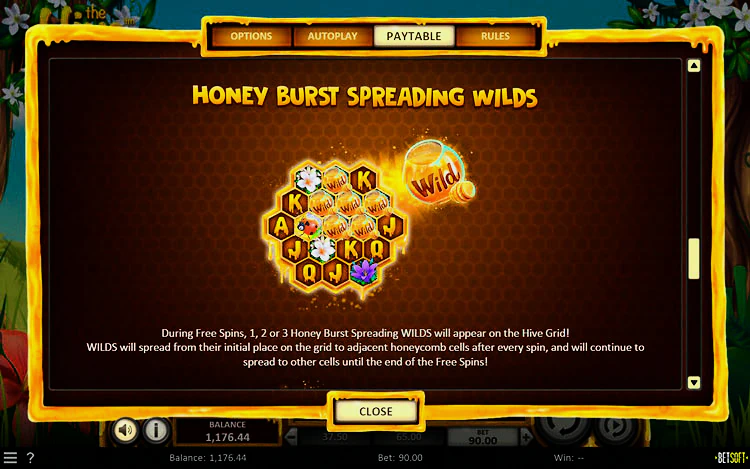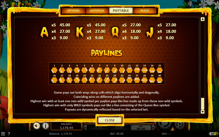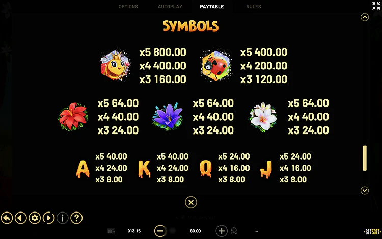 Слот предлагает простой игровой процесс, который не должен стать проблемой даже для новичков. В нижней части экрана есть полный набор элементов управления и настройки ставки. Кнопки слева позволяют выбрать размер ставки в диапазоне 0,25-125 кредитов за раунд.