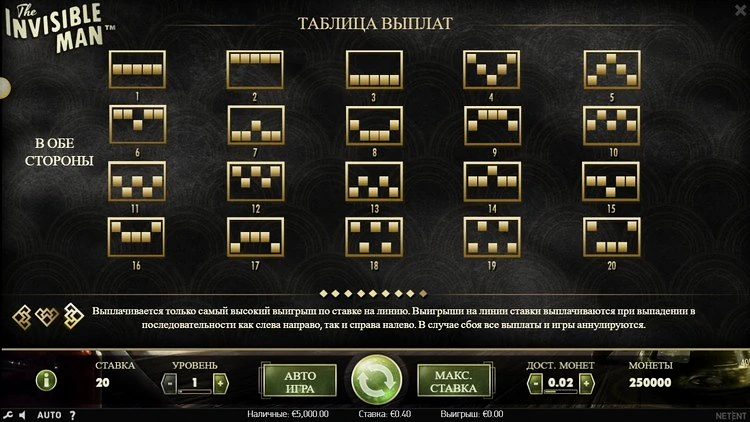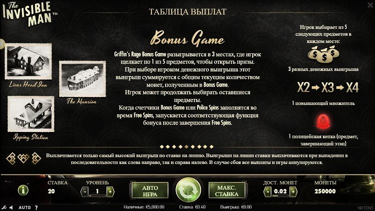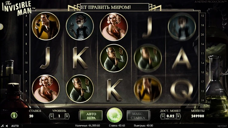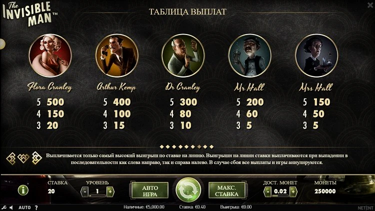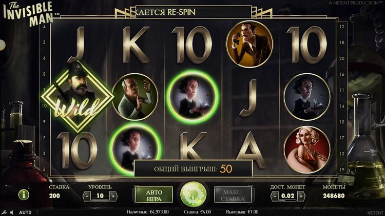 Этот впечатляющий игровой автомат основан на фильме 1930-х годов, но имеет графику 21 века. Превосходно разработанный, с пятью барабанами, 20 линиями выплат, двумя символами wild, двумя бесплатными вращениями, и бонусной игрой на выбор, я игровой автомат The Invisible Man от NetEnt понравится поклонникам научной фантастики и ужасов.