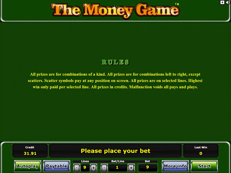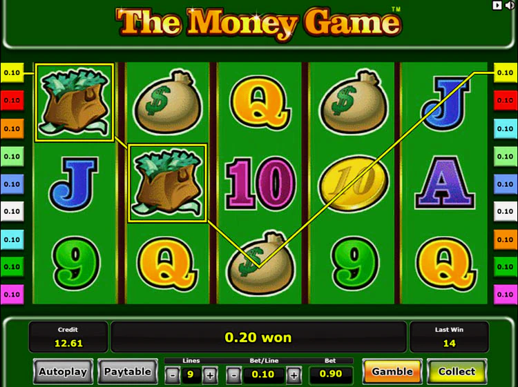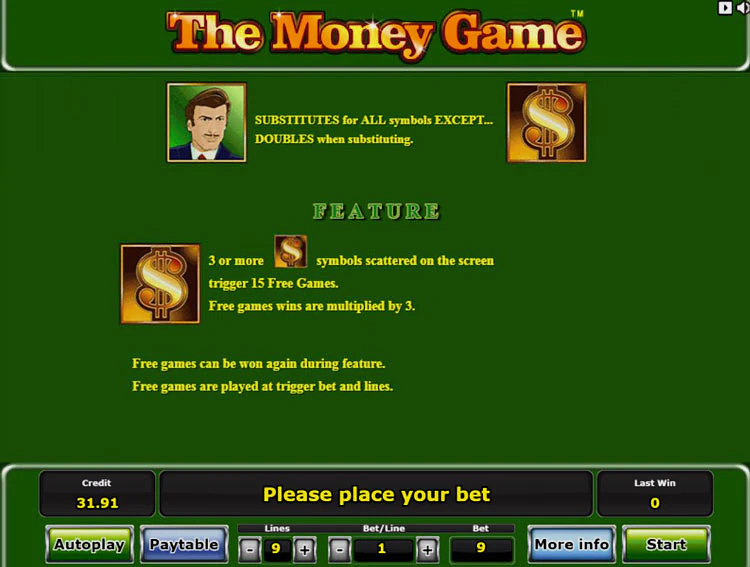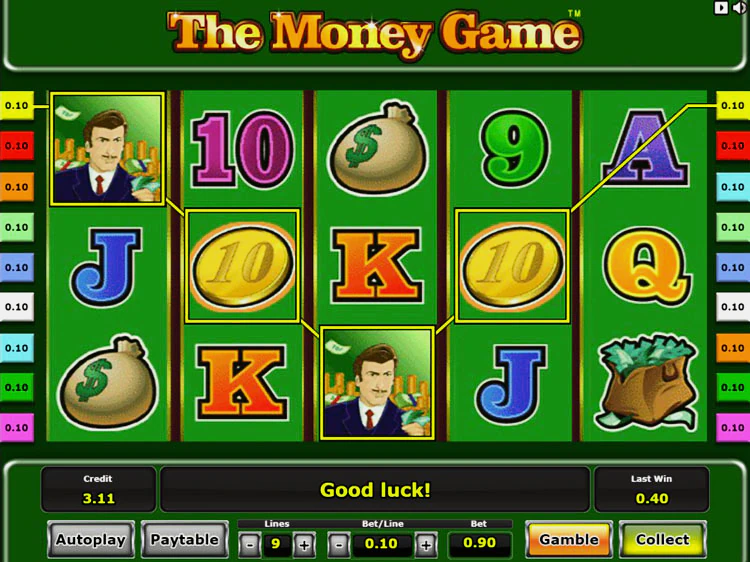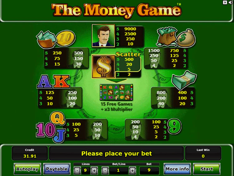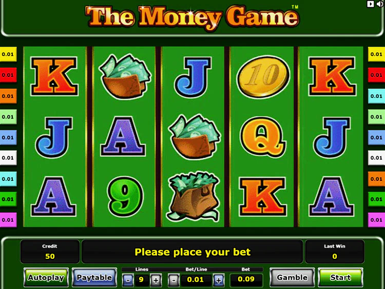 The Money Game имеет стандартную структуру из 5 барабанов и 9 регулируемых линий. Чтобы управлять игровым процессом, используйте кнопки, расположенные под барабанами. С их помощью вы можете открыть таблицу выплат, настроить линии и номинал монет, вращать барабаны и активировать опцию риск игры.