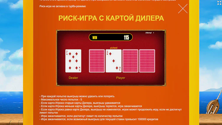 Также вы можете принять участие в риск игре, выбрав одну из четырех карт, расположенных лицом вниз. Цель состоит в том, чтобы выбрать карту с более высоким значением, чем текущая карта дилера, лежащая лицом вверх. Если вы сделаете правильный выбор, ваш выигрыш удвоится, но неверная попытка приведет к потере всех накопленных выигрышей.